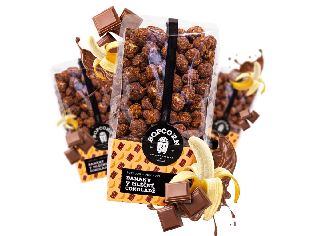 Kdo by neznal BANÁNKY V ČOKOLÁDĚ. My jsme z nich ale udělali exluzivní double glazovanou verzi popcornu. Kuličkový popcorn glazuje Michal v banánové omáčce, která navazuje na přirozenou a jemnou chuť primární lyofilizované suroviny. Následně je popcorn obalen v prémiové mléčné čokoládě, jejíž chuť převládá. Celkově má tato příchuť jemné banánové tóny s výraznou chutí čokolády.