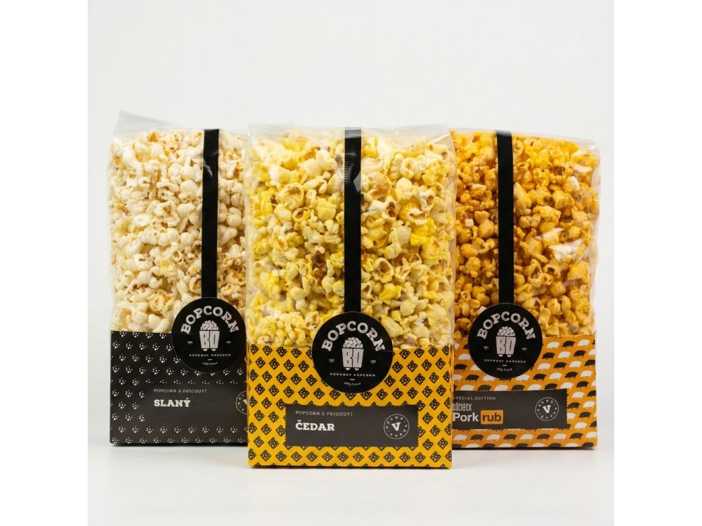 | Popcorn | Čedar | Sůl | Porkrub |
